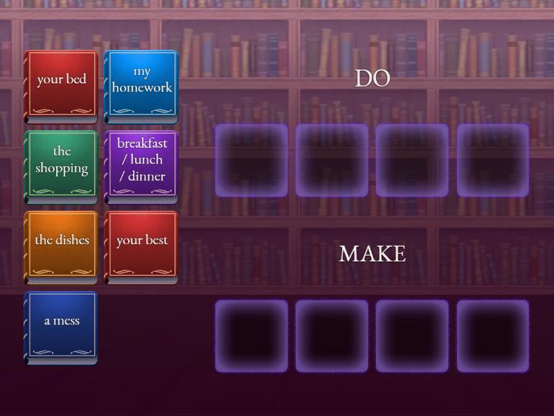 DO: my homework , the dishes , your best, the shopping, MAKE: a mess, your bed, breakfast / lunch / dinner,