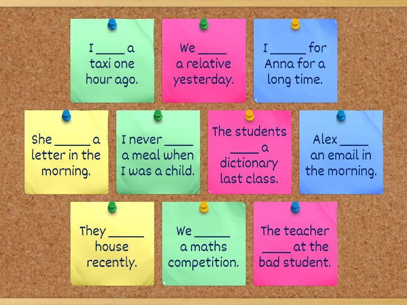 I _____ for Anna for a long time. - waited, She _____ a letter in the morning. - posted, We _____ a maths competition. - entered, They _____ house recently. - moved, We ____ a relative yesterday. - visited, The teacher ____ at the bad student. - shouted, I never ____ a meal when I was a child. - prepared, Alex ____ an email in the morning. - received, I ____ a taxi one hour ago. - called, The students ____ a dictionary last class. - used,