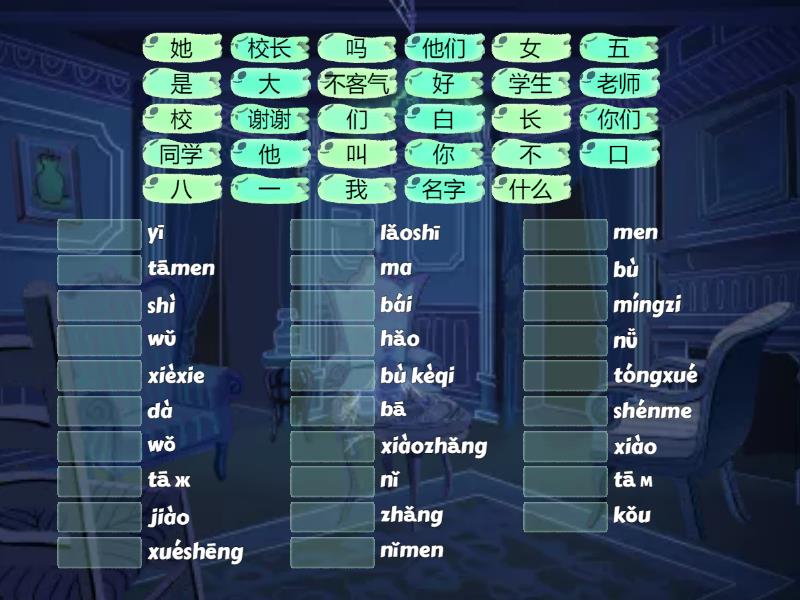 你 - nǐ, 好 - hǎo, 老师 - lǎoshī, 同学 - tóngxué, 们 - men, 我 - wǒ, 叫 - jiào, 他 - tā м, 是 - shì, 她 - tā ж, 你们 - nǐmen, 谢谢 - xièxie, 不客气 - bù kèqi, 什么 - shénme, 名字 - míngzi, 他们 - tāmen, 学生 - xuéshēng, 吗 - ma, 校 - xiào, 长 - zhǎng, 校长 - xiàozhǎng, 一 - yī, 五 - wǔ, 八 - bā, 大 - dà, 不 - bù, 口 - kǒu, 白 - bái, 女 - nǚ,