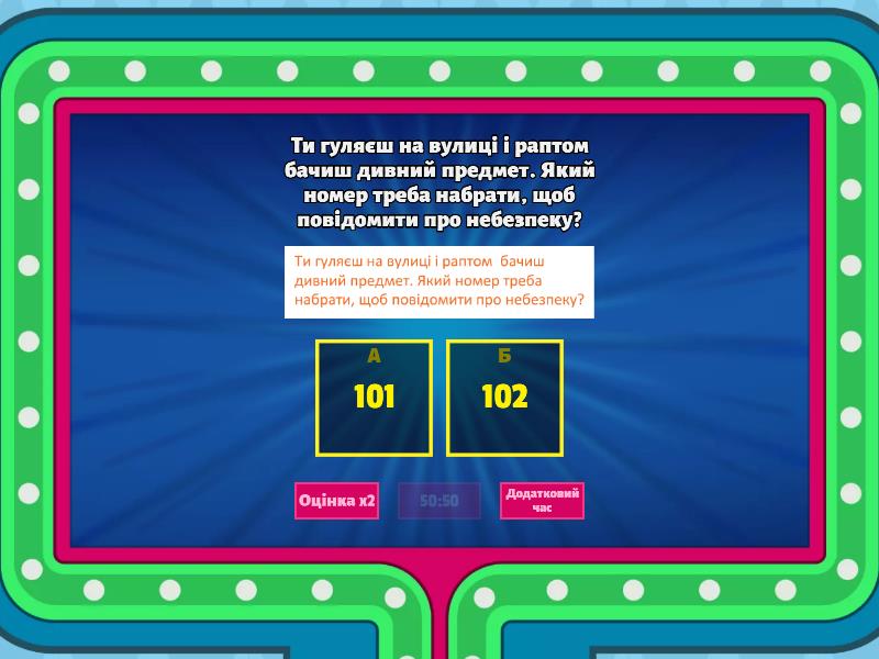 1) Ти гуляєш на вулиці і раптом бачиш дивний предмет. Який номер треба набрати, щоб повідомити про небезпеку? a) 101 b) 102 2) Які з цих знаків попереджають про міни? a) b) 3) Чому не можна самостійно торкатися підозрілих предметів? a) Бо ніхто не побачить b) Бо це небезпечно 4) У разі виявлення небезпечного предмету необхідно? a) Швидко тікати найближчою дорогою b) Повільно та спокійно рухатися назад тією самою дорогою 5) Де можуть ховатися ВНП? a) В місцях бойових дій, окупованих територіях, узбіччях, лісосмугах, покинутих будинках. b) В основному всі місця є безпечними, а ВНП тільки на полігонах 6) Чому необхідно дотримуватися правил мінної безпеки? a) Бо так сказали в міністерстві освіти b) Бо це необхідно для збереження життя