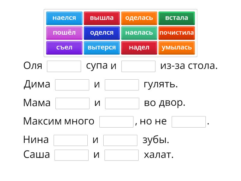 Оля ____ супа и ____ из-за стола. Дима ____ и ____ гулять. Мама ____ и ____ во двор. Максим много ____, но не ____. Нина ____ и ____ зубы. Саша ____ и ____ халат.