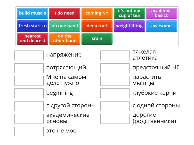 deep root - глубокие корни, fresh start to - beginning, coming NY - предстоящий НГ, weightlifting - тяжелая атлетика, nearest and dearest - дорогие (родственники), on one hand - с одной стороны, on the other hand - с другой стороны, I do need - Мне на самом деле нужно, academic basics - академические основы, awesome - потрясающий, it's not my cup of tea - это не мое, build muscle - нарастить мышцы, srain - напряжение,