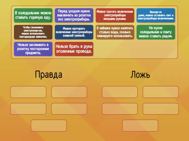 Правда: Нельзя засовывать в розетку посторонние предметы., Нельзя брать в руки оголенные провода., Перед уходом нужно выключить из розетки все электроприборы., Чтобы сэкономить электроэнергию, можно использовать светодиодные лампочки., В чайнике нужно кипятить столько воды, сколько планируете использовать., Ложь: Можно трогать включенные электроприборы мокрыми руками., Можно протирать включенные электроприборы влажной тряпкой., Выходя из дома, можно оставлять свет и электроприборы включенными., В холодильник можно ставить горячую еду., На кухне холодильник и плиту можно ставить рядом.,