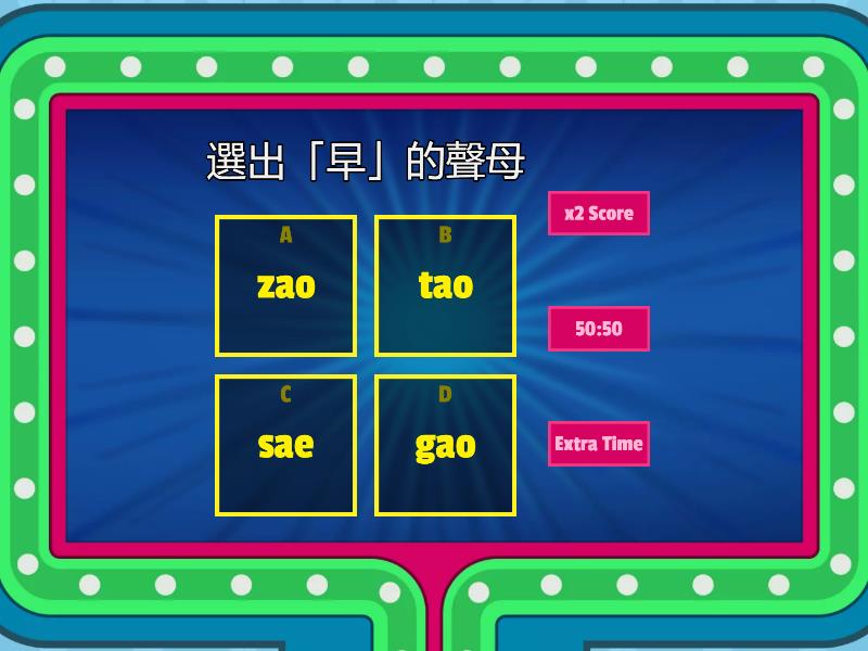 1) 選出「早」的聲母 a) zao b) tao c) sae d) gao 2) 返回Q1,「a」應加上 a) 、 b) v c) - d) / 3) 「餃」拼音是: a) jibo b) jkop c) jiao d) hjik 4) 「 黃」的拼音: a) huang b) uang c) weng d) wang 5) 「錯」的拼音: a) ceo b) cwo c) coo d) cuo 6) 「彩」的拼音: a) csi b) cai c) cei d) cdi 7) 選擇三個正確的u行韻母。 a) u, he, wai b) u, ueng, ueng c) s, he, ueng d) u, ueng, he 8) 選出「紫」的拼音 a) zi b) si c) di d) ei e) ert f) art