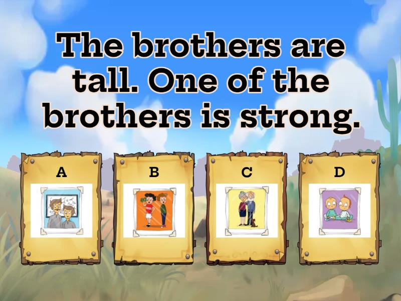 1) The brothers are tall. One of the brothers is strong. a) b) c) d) 2) They are identical twins. a) b) c) d) 3) They are not identical twins. They are young. a) b) c) d) 4) They are clever. a) b) c) d) 5) They are old and they are nice. a) b) c) d) 6) They are short and pretty. They are 35 years old. a) b) c) d) 7) They are brothers. One of the brothers is tall. a) b) c) d)