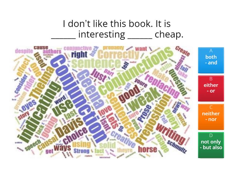 1) I don’t like this book. It is ______ interesting ______ cheap. a) both - and b) either - or c) neither - nor d) not only - but also 2) Neither Linda nor I _____ classical music. a) liking b) liked c) like d) likes 3) The baby is only two months old. He can ____ speak ____walk. a) neither - nor b) either - or c) both - and d) not - nor 4) He _______ a teacher or a doctor. a) is neither b) neither is c) is either d) either is 5) John is very poor. He has ______ house ______ money. a) both - and b) either - or c) neither - nor d) not only - but also 6) ______ Linh ______ her sister like listening to pop music. a) Both - and b) Either - or c) Neither - nor d) Not only - but also 7) Neither my friend nor I _____ that movie. a) don't like b) likes c) doesn't like d) like 8) Who wrote you this love letter? - I'm not sure. I think it was ___ Michael ___ Paul. a) both - and b) either - or c) neither - nor 9) ___ Linda ___ Helen called to say sorry. I'm very sad and frustrated. a) Both - and b) Either - or c) Neither - nor 10) ___ Ryan ___ Susie have disappointed me. They didn't come to my birthday party. a) Both - and b) Either - or c) Neither - nor 11) ___ loyalty ___ honesty are essential in a friendship. a) Both - and b) Either - or c) Neither - nor d) Not only - but also 12) Neither my brother ________________ my mother knows about this. a) both b) neither c) and d) nor 13) I felt ________________ happy and sad at the same time. a) both b) neither c) either 14) He ________________ has a cat or a dog. I can't remember. a) too b) either c) neither d) nor 15) I'm thinking of traveling to either Argentina ________________ Brazil. a) or b) either c) neither d) nor 16) I left it ____ on the table ____ in the drawer. a) either - nor b) neither - or c) either - or d) neither - nor 17) ____ the radio ____ the television works properly. a) Neither - nor b) Neither - or c) Either - nor d) Either - or 18) He ____ could not come ____ did not want to. a) either - or b) neither - or c) either - nor d) neither - nor