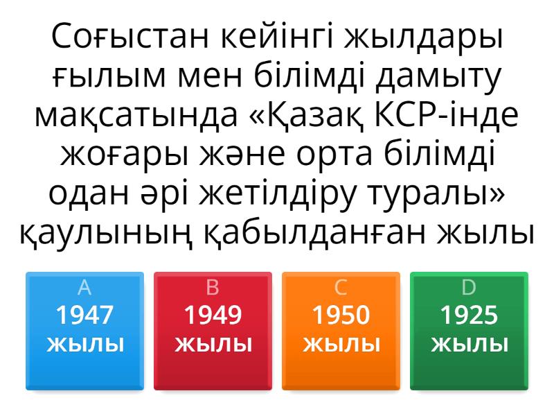 1) Соғыстан кейінгі жылдары ғылым мен білімді дамыту мақсатында «Қазақ КСР-інде жоғары және орта білімді одан әрі жетілдіру туралы» қаулының қабылданған жылы a) 1947 жылы b) 1949 жылы c) 1950 жылы d) 1925 жылы 2) Мектептердегі білім беруге қажетті қаржының көлемін ұлғайтуға байланысты бөлінген ақша сомасы a) 1941 жылы 250 млн сом бөлінсе, 1945 жылы 500 млн сом бөлінді b) 1946 жылы 85,6 млн сом бөлінсе, 1950 жылы 146,5 млн сом бөлінді c) ақша бөлінбеді d) ақша көлемі азайтылды 3) Тұтас алғанда 1950 жылға қарай республикадағы жұмыс істеген мектептер саны мен оқушылар саны a) 9100 мектеп жұмыс істеп, 1 млн оқушы білім алды b) 9098 мектеп жұмыс істеп, 1 млн 450 мың оқушы білім алды c) 9250 мектеп жұмыс істеп, 1 млн 655 мың оқушы білім алды d) 9088 мектеп жұмыс істеп, 1 млн 439 мың оқушы білім алды 4) Соғыстан кейінгі жылдардағы қазақ мектептерінің ауыр жағдайы a) техикалық жабдықтаудың қолға алынуы b) «болашағы жоқ» елді мекендер жойылып, шағын жинақты қазақ мектептері жабылды c) орыс мектептерінің ашылуы d) оқулықтардың жазыла бастауы 5) Мектептердегі білім беру ісінің тоталитарлық тәртіптік көрінісі a) педагог мамандарының даярлануы b) оқулықтардың жазыла бастауы c) техикалық жабдықтаудың қолға алынуы d) 1950-70 жылдары орыс тілінде оқытатын мектептер 1,5 млн-ға артқанда, қазақ мектептері 3891-ден 2577-ге азайды 6) Ұлы Отан соғысынан кейінгі жылдарда мектептерге көмек көрсетуге қор жасау үшін ұйымдастырылған шара: a) Сенбіліктер b) Жексенбіліктер c) Жылу жинау d) Асар 7) Ұлы Отан соғысынан кейінгі жылдарда халық сирек қоныстанған аудандарда малшы балалары үшін салынды: a) Пансионаттар b) Жексенбілік мектептер c) Кешкі мектептер d) Мектеп-интернаттар 8) Ұлы Отан соғысынан кейінгі жылдарда жалпыға бірдей міндетті жетіжылдық білім беру ісі қайтадан қолға алынды: a) 1949 жылы b) 1925 жылы c) 1956 жылы d) 1958 жылы 9) Жалпыға бірдей міндетті сегізжылдық білім беруге көшу көзделді: a) 1949-1950 оқу жылынан бастап b) 1962-1963 оқу жылынан бастап c) 1970-1971 оқу жылынан бастап d) 1980-1981 оқу жылынан бастап 10) Жалпыға бірдей орта білім беруге көшу науқаны өріс алды: a) 1940 жылдар ішінде b) 1960 жылдар ішінде c) 1970 жылдар ішінде d) 1980 жылдар ішінде