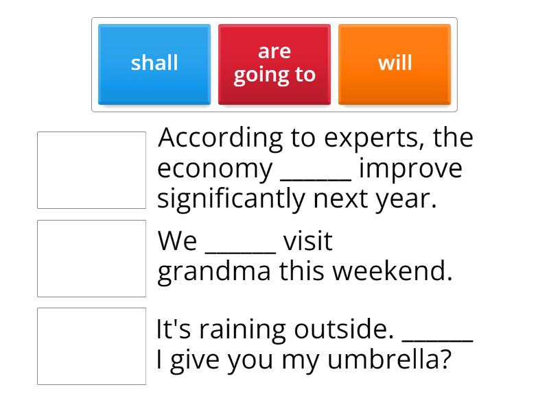 shall - It's raining outside. ______ I give you my umbrella?, will - According to experts, the economy ______ improve significantly next year., are going to - We ______ visit grandma this weekend.,