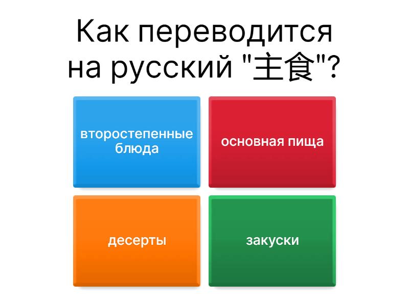 1) Как переводится на русский "主食"? a) второстепенные блюда b) основная пища c) десерты d) закуски 2) Как переводится на русский "甜点"? a) десерты b) торт c) шоколад d) 副食 3) Как переводится на русский "瓜子"? a) арбуз b) печенье c) дыня d) семечки 4) Как переводится на китайский "второстепенные блюда"? a) 主食 b) 副食 c) 馒头 d) 布丁 5) Как переводится на китайский "тушеная свинина"? a) 红烧肉 b) 炒青菜 c) 清蒸鱼 d) 烧肉 6) Как переводится на китайский "жарить во фритюре"? a) 煎 b) 蒸 c) 炸 d) 炒 7) Как переводится на китайский "тушить"? a) 炒 b) 煮 c) 蒸 d) 烩 8) Как переводится на русский "切"? a) 切 b) варить c) смешивать d) жарить (во фритюре) 9) Как переводится на русский "煎"? a) жарить (во фритюре) b) поджаривать c) жарить (на масле) d) тушить 10) Как переводится на русский "拌"? a) тушить b) смешивать c) жарить (на масле) d) разрезать 11) Как переводится на китайский "ресторан"? a) 食堂 b) 咖啡馆 c) 餐厅 d) 餐馆 12) Как переводится на китайский "бронировать (столик)"? a) 点菜 b) 叫 c) 预定 d) 拌 13) Как переводится на китайский "кислый? a) 咸 b) 酸 c) 辣 d) 过敏 14) Как переводится на русский "过敏"? a) вегетарианская еда b) смешивать c) заказывать еду d) аллергия 15) Как переводится на русский "咸"? a) соленый b) острый c) сладкий d) аллергия
