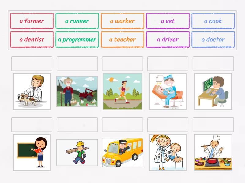 a doctor, a teacher, a worker, a programmer, a farmer, a runner, a dentist, a cook, a vet, a driver,