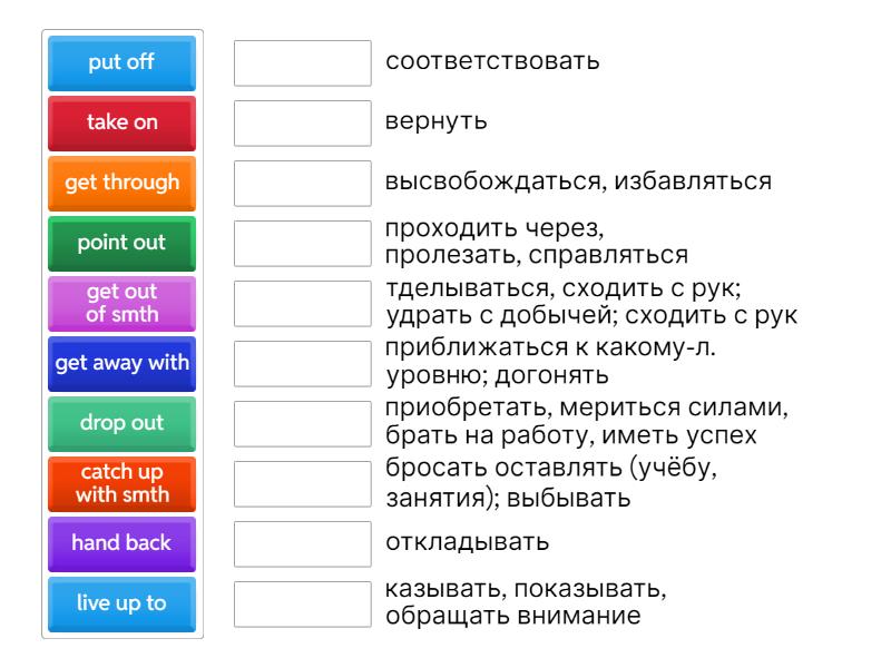 drop out  - бросать оставлять (учёбу, занятия); выбывать, live up to  - соответствовать , hand back  - вернуть, get away with  - тделываться, сходить с рук; удрать с добычей; сходить с рук, point out  - казывать, показывать, обращать внимание, put off - откладывать , get through  - проходить через, пролезать, справляться, get out of smth  - высвобождаться, избавляться, take on  - приобретать, мериться силами, брать на работу, иметь успех, catch up with smth  - приближаться к какому-л. уровню; догонять,