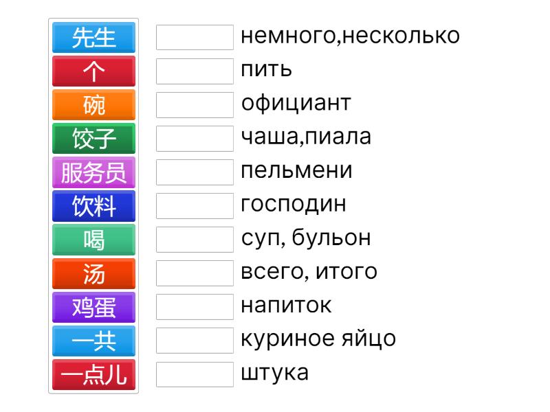 饺子 - пельмени, 服务员 - официант, 先生 - господин, 一点儿 - немного,несколько, 个 - штука, 喝 - пить, 饮料 - напиток, 碗 - чаша,пиала, 鸡蛋 - куриное яйцо, 汤 - суп, бульон, 一共 - всего, итого,