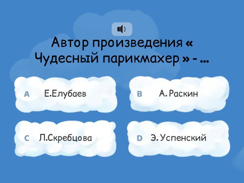 1) Автор произведения « Чудесный парикмахер » - ... a) Е.Елубаев b) А. Раскин c) Л.Скребцова d) Э. Успенский  2) Отметь главного героя произведения. a) Мартин b) учитель-парикмахер 3) О чём пожалел Мартин, когда подстригал незнакомку? a) пришёл домой поздно b) ничему не научился у своего отца c) заснул d) благодарил отца  4) Отметь героя, который произнёс такие слова: «Если посетитель выходит из твоей парикмахерской с улыбкой на лице, значит твои руки потрудились на славу» a) незнакомка b) учитель-парикмахер c) Мартин d) отец 5) Где, кроме обучения у старейшего городского парикмахера, черпал знания Мартин? a) из книг b) из интернета c) из телепередач d) из журнала  6) Как называли парикмахеров в древности? a) волосорезы b) расчёски c) волосочёсы и причёсники d) массажки 7) Что делал Мартин, когда к нему в парикмахерскую постучалась старуха? a) ужинал b) пел c) обедал d) читал книгу 8) Что сделал Мартин для сгорбленной некрасивой старухи? a) отдал ужин и сделал стрижку b) поругал  c) посмеялся над ней d) выгнал 9) Кем была незнакомка в образе старухи? a) злой колдуньей b) Бабой-Ягой c) Ведьмой d) феей из волшебной страны мастерства 10) Почему девушка-незнакомка вернулась к Мартину? a) у Мартина было волшебное кольцо b) это была случайная встреча c) Мартин стал искусным мастером и добрым человеком d) у Мартина была расческа