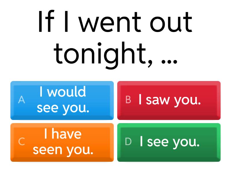 1) If I went out tonight, ... a) I would see you. b) I saw you. c) I have seen you. d) I see you. 2) If you got back late, ... a) I am angry. b) I was angry. c) I have been angry. d) I would be angry. 3) ... , I would be surprised. a) If he came, b) If he was coming, c) If he is coming, 4) ... , we would be late. a) If we are waiting here, b) If we waited here,  c) If we were waiting here, d) If we have waited here, 5) If we .......... (go) on holiday this summer, we .......... (go) to Spain. a) are going - are going b) were going - went c) went - would go d) went - went 6) What would you do if .......... ? a) everything went wrong b) everything is going wrong c) everything would go wrong d) everything goes wrong 7) If he went to university, he .......... a) will needs how to cook. b) needs to learn how to cook. c) would need to learn how to cook. d) needed to learn how to cook. 8) If we .......... hurry up, we'd miss the bus. a) wouldn't b) aren't c) weren't d) didn't 9) What would we do if John .......... (not / come) ? a) didn't come b) isn't coming c) wasn't coming d) wouldn't come 10) If I were you, I _____a new job. a) get b) got c) would get d) am getting 11) If I _____ enough money, I would buy a big house. a) have b) had c) haven't d) hadn't 12) If we _____ in Spain, we could speak Spanish. a) lived b) live c) would live d) were living 13) If she _____ the exam, she _____ enter the university. a) passed - would b) passed - will c) pass - would d) would pass - could 14) He _____ happier if he _____ more friends. a) can be - had b) would be - had c) would be - have d) will be - has 15) If he _____ the match, he wouldn't be champion. a) can't b) wouldn't win c) didn't win d) don't win