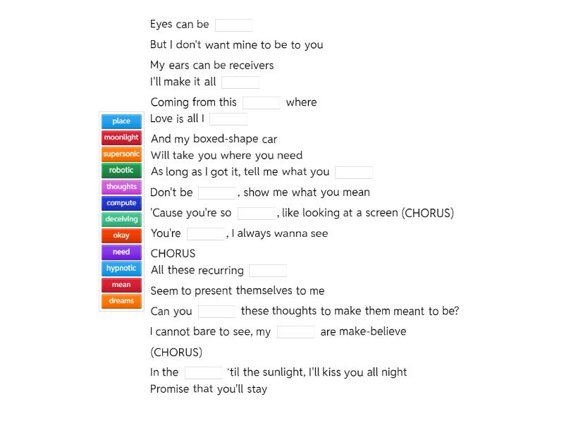 Eyes can be ____ But I don't want mine to be to you My ears can be receivers I'll make it all ____ Coming from this ____ where Love is all I ____ And my boxed-shape car Will take you where you need As long as I got it, tell me what you ____ Don't be ____, show me what you mean 'Cause you're so ____, like looking at a screen (CHORUS) You're ____, I always wanna see CHORUS All these recurring ____ Seem to present themselves to me Can you ____ these thoughts to make them meant to be? I cannot bare to see, my ____ are make-believe (CHORUS) In the ____ ‘til the sunlight, I'll kiss you all night Promise that you'll stay