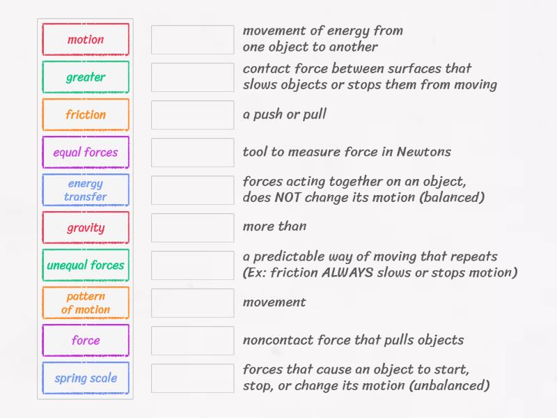 force - a push or pull, energy transfer - movement of energy from one object to another, equal forces - forces acting together on an object, does NOT change its motion (balanced), unequal forces - forces that cause an object to start, stop, or change its motion (unbalanced), gravity - noncontact force that pulls objects, friction - contact force between surfaces that slows objects or stops them from moving, motion - movement , greater - more than, spring scale - tool to measure force in Newtons, pattern of motion - a predictable way of moving that repeats (Ex: friction ALWAYS slows or stops motion),
