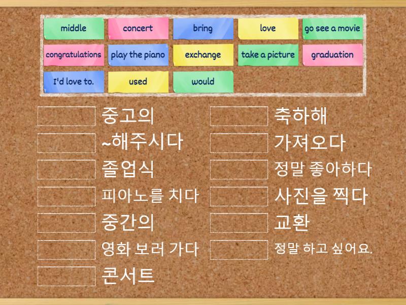 would - ~해주시다, bring - 가져오다, used - 중고의, exchange - 교환, love - 정말 좋아하다 , graduation - 졸업식, congratulations - 축하해, middle - 중간의, concert - 콘서트, I'd love to.  - 정말 하고 싶어요. , go see a movie - 영화 보러 가다 , play the piano  - 피아노를 치다 , take a picture - 사진을 찍다,