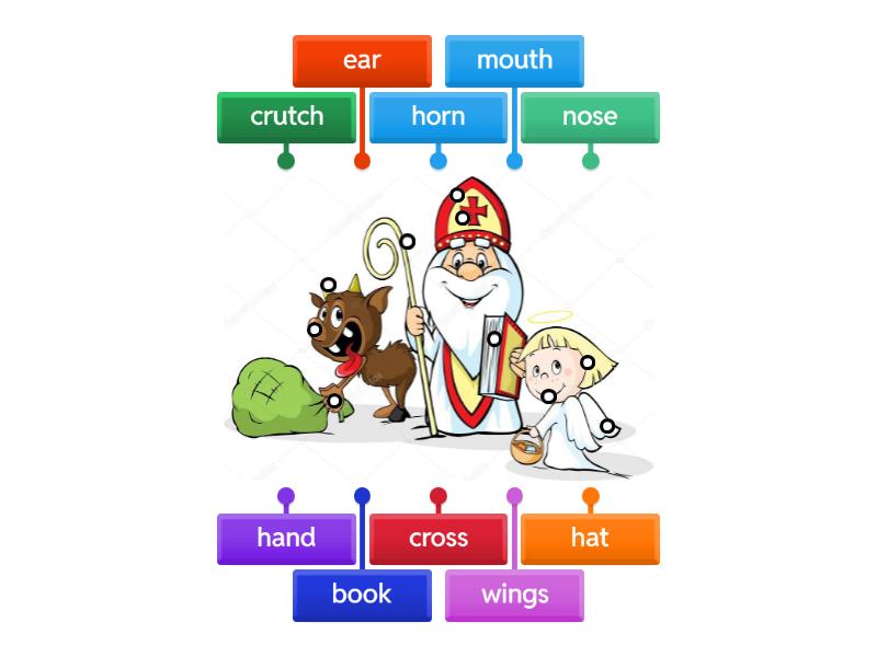 horn, cross, hat, crutch, wings, book, nose, ear, hand, mouth.