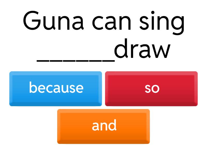 1) Guna can sing ______draw a) because b) so c) and 2) Come _______ sit here a) but b) if c) And 3) I like singing _________ I don't like dancing a) and b) but c) if 4) She bought apple ________ grapes a) and b) if c) so 5) she is sick. ____________ she ate icecream. a) but b) so c) Because 6) Ravi fell over_______ he was not hurt.  a) but b) because c) if 7) The dog barked wagged his tail a) so b) if c) and 8) I went home I was scared a) if b) because c) so 9) She will pick pink _______ red dresss a) because b) or c) if 10) Rani cooks biriyani_______ fish fry a) because b) and c) or