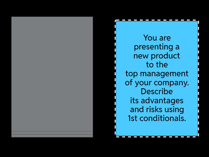 You are a line manager and need to set up a guide for the newcomers to your company. Make up a list of guidelines using zero conditionals., You are presenting a new product to the top management of your company. Describe its advantages and risks using 1st conditionals., You are discussing outcomes of a networking event with your team. Think of what could go different using 2nd conditionals., Remember your unlucky day and try to imagine what would have happened if the events or actions had been different. Speculate about it using 3rd conditionals..