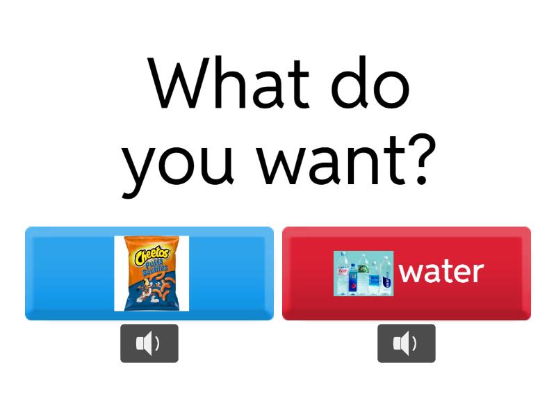 1) What do you want? a) b) water 2) What toy do you want? a) bucket blocks b) hand clap fidgit toy 3) What do you want to do? a) use the bathroom b) rest in blanket 4) I want.... a) I want to play iPad b) to take a break 5) i want a) blue squishy ball b) kitty craft toy