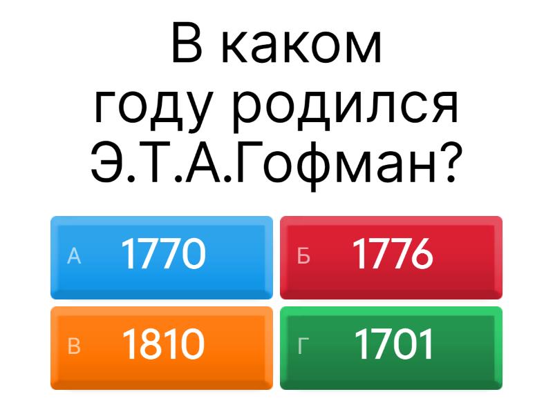 1) В каком году родился Э.Т.А.Гофман? a) 1770 b) 1776 c) 1810 d) 1701 2) Кем был Э.Т.А.Гофман? a) Писатель b) Музыкант c) Художник d) Все ответы верны 3) В честь какого выдающегося композитора Гофман сменил имя Вильгельм на Амадей? a) Бах b) Бетховен c) Моцарт d) Вивальди 4) Кто оказал большое влияние на становление личности Гофмана? a) Отец b) Бабушка c) Дядя d) Старший брат 5) Кем стал работать Гофман после окончания Кёнигсбергского университета? a) Издателем b) Секретарём c) Преподавателем d) Чиновником 6) К чему Гофман испытывал страсть с юных лет? a) Рисование b) Музыка c) Литература d) Все ответы верны 7) Как называется знаменитая опера Гофмана? a) «Ундина» b) «Нимфа» c) «Весталка» d) «Наяда 8) Как называется первое опубликованное литературное произведение Гофмана? a) «Кавалер Глюк» b) «Дон Жуан» c) «Повелитель блох» d) «Музыкальные страдания Иоганна Крейслера, капельмейстера» 9) Как называется сказка Гофмана, прославившая его на весь мир? a) «Песочный человек» b) «Золотой горшок» c) «Крошка Цахес, по произведению Циннобер» d) «Щелкунчик и Мышиный король» 10) В каком году умер Гофман? a) 1822 b) 1825 c) 1829 d) 1831
