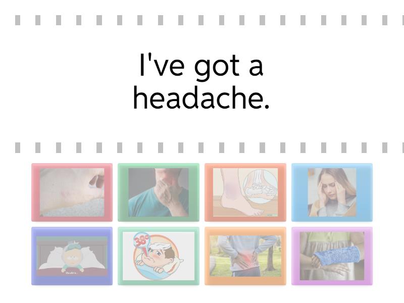 I've got a headache., Something has bitten me., I've hurt my back., I've got a sore throat., I've broken my arm., I feel sick., I've got a temperature., I've sprained my ankle.,