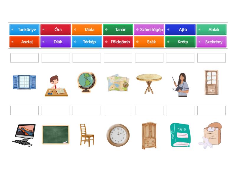 Tábla, Kréta, Asztal, Szék, Ablak, Ajtó, Földgömb, Térkép, Szekrény, Óra, Számítógép, Tanár , Diák , Tankönyv ,