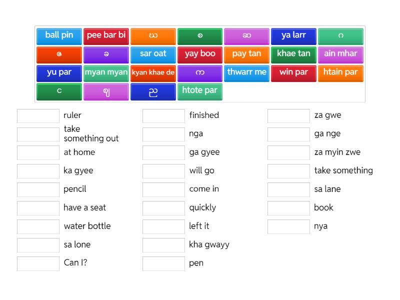 က - ka gyee, ခ - kha gwayy, ဂ - ga nge, ဃ - ga gyee, င - nga , စ - sa lone, ဆ - sa lane, ဇ - za gwe, ဈ - za myin zwe, ည - nya, pee bar bi - finished, ain mhar - at home, kyan khae de - left it, thwarr me - will go, yu par - take something, ya larr - Can I?, myan myan - quickly, win par - come in, htain par - have a seat, htote par - take something out, sar oat - book, ball pin - pen, khae tan - pencil, pay tan - ruler, yay boo - water bottle,