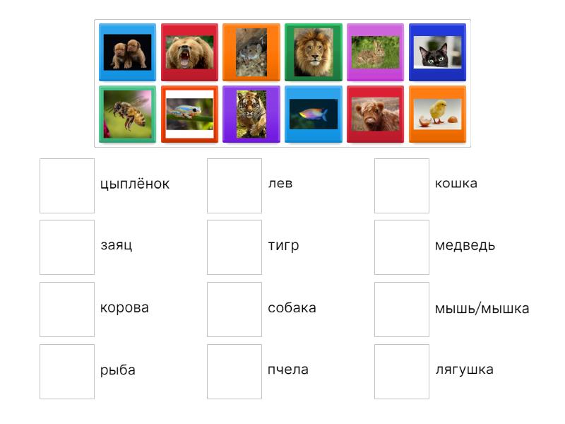 рыба, цыплёнок, кошка, корова, собака, мышь/мышка, медведь, лягушка, пчела, лев, заяц, тигр,