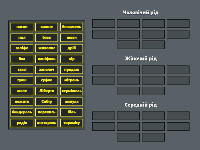 Чоловічий рід : біль, дріб, живопис, кір, насип, нежить, перекись, пил, продаж, Сибір, Жіночий рід : анстороль, бандероль, бешамель, бязь, вермішель, гуаш, жовч, заполоч, каніфоль, мігрень, Середній рід : ампула, Ліберто, кашне, таксі, радіо, желе, суфле, тирамісу, боа, галіфе,