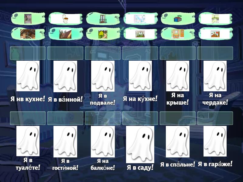 Я в спа́льне!, Я на балко́не!, Я в гости́ной!, Я в гара́же!, Я на ку́хне!, Я в саду!, Я нв кухне!, Я на крыше!, Я на чердаке!, Я в ва́нной!, Я в туале́те!, Я в подвале!,