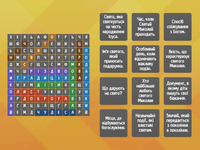 молитва - Спосіб спілкування з Богом., різдво - Свято, яке святкується на честь народження Ісуса., доброта - Якість, що характеризує святого Миколая., подарунки - Що дарують на свято?, церква - Місце, де відбуваються богослужіння., чудеса - Незвичайні події, які властиві святим., свято - Особливий день, коли відзначають важливу подію., діти - Хто найбільше любить святого Миколая, миколай - Ім'я святого, який приносить подарунки., лист - Документ, в якому діти пишуть свої бажання., традиція - Звичай, який передається з покоління в покоління., ніч - Час, коли Святий Миколай приходить.,