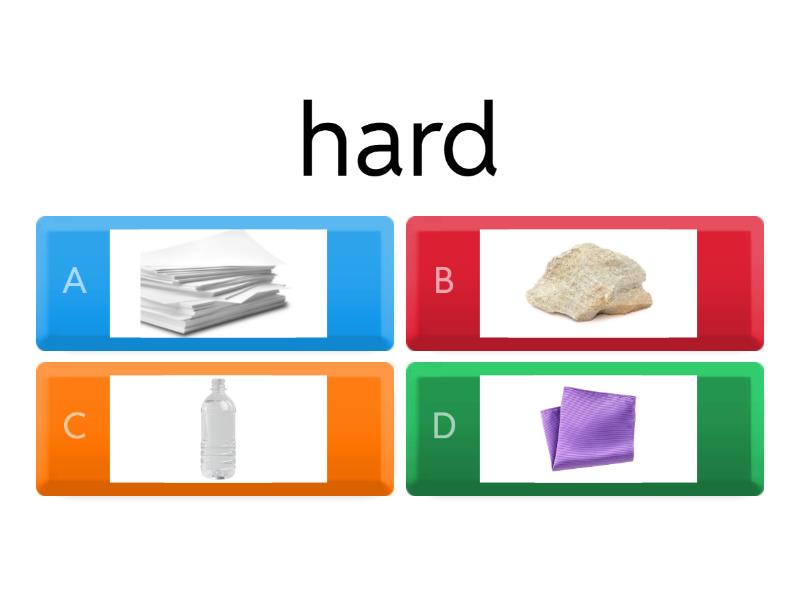 1) hard a) b) c) d) 2) soft a) b) c) d) 3) weak a) b) c) d) 4) strong a) b) c) d) 5) shiny a) b) c) d) 6) dull a) b) c) d) 7) waterproof a) b) c) d) 8) absorbent a) b) c) d) 9) flexible a) b) c) d) 10) rigid a) b) c) d) 11) smooth a) b) c) d) 12) rough a) b) c) d) 13) Wood is a _________________ material.  a) rough b) flexible c) dull d) soft 14) Rubber is a __________________ material. a) rough b) rigid c) strong d) flexible 15) Rock is a _____________ material. a) soft b) strong c) flexible d) shiny 16) Glass is a __________________ material. a) soft b) flexible c) rigid d) shiny 17) Plastic is a ______________________ material. a) shiny b) soft c) absorbent d) waterproof 18) Fabric is a(n) ________________________ material. a) hard b) absorbent c) strong d) waterproof 19) Metal is a ___________________ material. a) hard b) soft c) flexible d) dull 20) Fabric is a _________________ material.  a) soft b) shiny c) hard d) rigid 21) Paper is a ______________________ material a) shiny b) waterproof c) strong d) weak