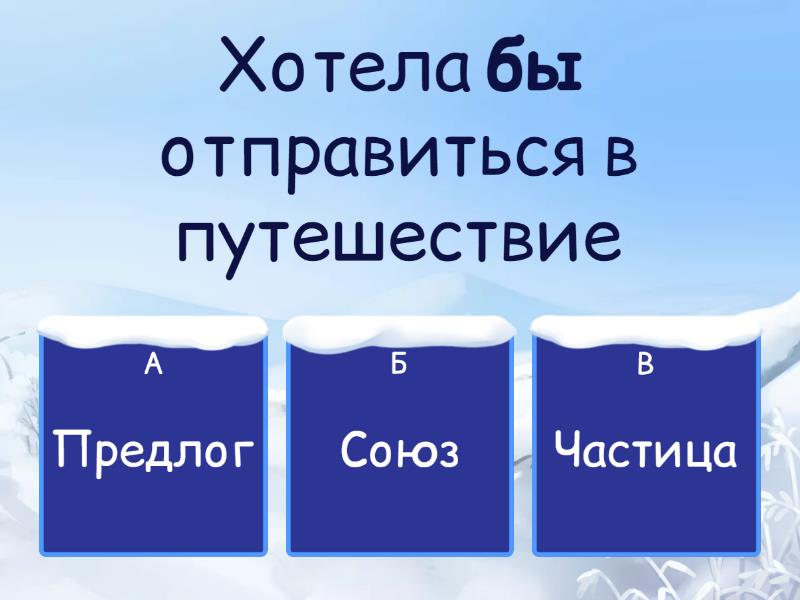 1) Хотела бы отправиться в путешествие a) Предлог b) Союз c) Частица 2) Ввиду плохого самочувствия я не пошел в школу. a) Предлог b) Союз c) Частица 3) В течение ближайших суток погода не изменится. a) Предлог b) Союз c) Частица 4) Эта работа была нелегкой, зато полезной. a) Предлог b) Союз c) Частица 5) Пусть будут счастливы все, все твои друзья! a) Предлог b) Союз c) Частица 6) Получилось что-то вроде самодельного велосипеда a) Предлог b) Союз c) Частица 7) Разве я говорю что-нибудь дурное? a) Предлог b) Союз c) Частица 8) Я хочу, чтобы вы больше читали a) Предлог b) Союз c) Частица 9) В продолжение всей лекции слушатели были весьма внимательны a) Предлог b) Союз c) Частица 10) Навстречу Маше выбежал симпатичный щенок. a) Предлог b) Союз c) Частица 11) Я тоже иду в кино. a) Предлог b) Союз c) Частица