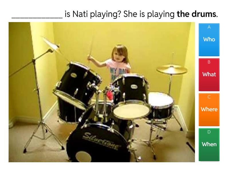 1) ____________ is Nati playing? She is playing the drums. a) Who b) What c) Where d) When 2) ____________ is Nina playing volleyball? She is playing in the park. a) Who b) What c) Where d) When 3) __________ is Ádám talking to? He is talking to Vince. a) Who b) What c) Where d) When 4) _________ is your birthday? It is on 29th October. a) Who b) What c) Where d) When 5) _________ her favourite sport? Her favourite sport is fencing. a) Who b) What c) Where d) When 6) _________ is your English teacher? It's Miss Edit. a) Who b) What c) Where d) When 7) _________ is your favourite food? It's sushi. a) Who b) What c) Where d) When 8) _________ time is it now? It's 7:30 pm now. a) Who b) What c) Where d) When