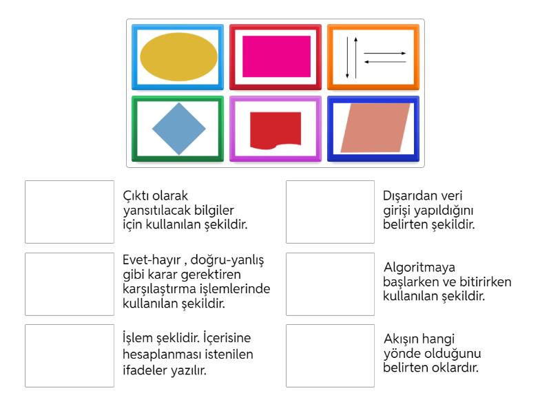 Algoritmaya başlarken ve bitirirken kullanılan şekildir., Dışarıdan veri girişi yapıldığını belirten şekildir., Evet-hayır , doğru-yanlış gibi karar gerektiren karşılaştırma işlemlerinde kullanılan şekildir., İşlem şeklidir. İçerisine hesaplanması istenilen ifadeler yazılır. , Akışın hangi yönde olduğunu belirten oklardır., Çıktı olarak yansıtılacak bilgiler için kullanılan şekildir.,