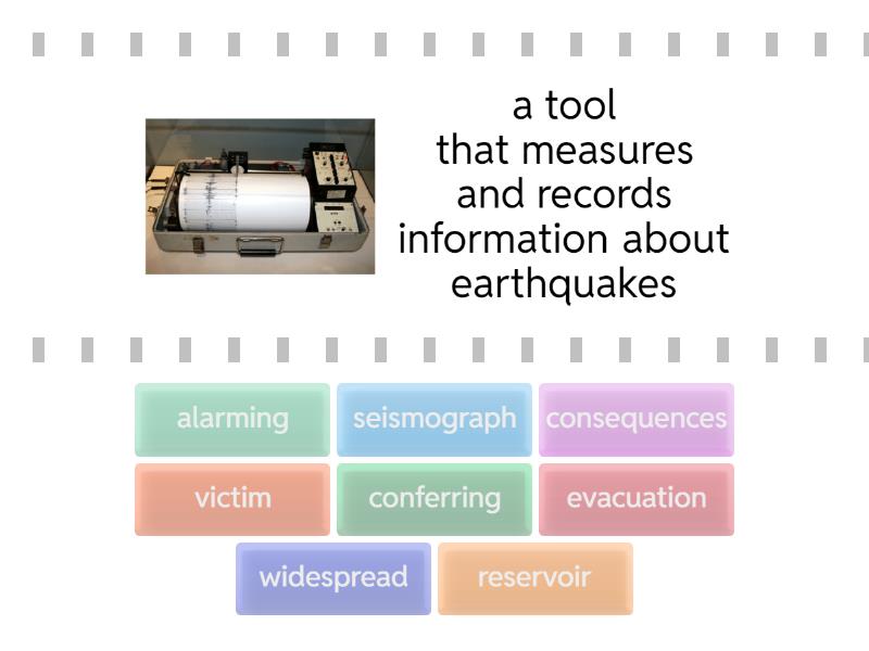 seismograph - a tool that measures and records information about earthquakes, evacuation - leaving a dangerous area to a safer one, reservoir - where a supply of something is collected, conferring - discussing an idea with someone , consequences - the outcomes or effects of an event, widespread - something that happens over a large area or among many people, alarming - something that makes you worry that something bad may happen, victim - someone who suffers,