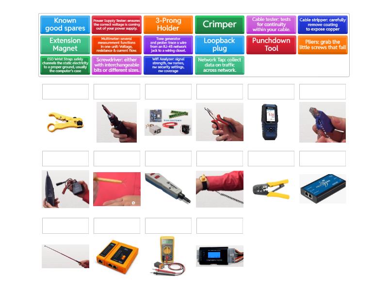 Multimeter: several measurement functions in one unit: Voltage, resistance & current flow., Cable stripper: carefully remove coating to expose copper, Crimper, Cable tester: tests for continuity within your cable., ESD Wrist Strap: safely channels the static electricity to a proper ground, usually the computer's case, Screwdriver: either with interchangeable bits or different sizes.  , Pliers: grab the little screws that fall, Extension Magnet, 3-Prong Holder, Power Supply Tester: ensures the correct voltage is coming out of your power supply., Tone generator and probe: trace a wire from an RJ-45 network jack to a wiring closet., Wifi Analyzer: signal strength, nw names, nw security settings, nw coverage, Network Tap: collect data on traffic across network., Punchdown Tool, Loopback plug, Known good spares,