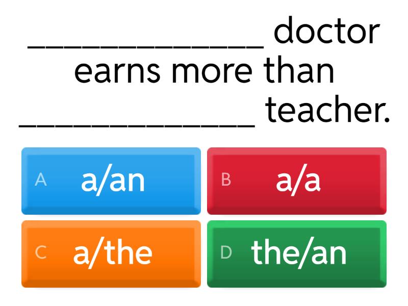 1) _____________ doctor earns more than _____________ teacher. a) a/an b) a/a c) a/the d) the/an 2) What’s ______ capital of your country? a) a b) an c) the  d) Ø 3) She lives in _____________ England, which is part of _____________ UK. a) Ø/a b) Ø/the c) the/Ø d) Ø/Ø 4) Munich lies in _____________ south of Germany. a) the b) a c) an d) Ø 5) .I don't like ______ museums. I never go to any when I'm in ______ London. a) the/Ø b) the/the c) Ø/the d) Ø/Ø 6) I like ______ coffee but I don't like ______ coffee they make at ______ office. a) Ø/the/the b) Ø/the/a c) the/Ø/Ø d) a/the/Ø 7) Statistics say that ______ women live longer than ______ men. a) the /the b) Ø/the c) Ø/Ø d) the/Ø 8) My uncle is _____ engineer at ______ local garage. a) a/a b) an/the c) an/a d) the/Ø 9) ______ happiness doesn't come from ______ money. a) Ø/the b) the/the c) Ø/Ø d) the/Ø 10) We usually go by ______ train, but today we’re taking ______ bus. a) Ø/the b) the/Ø c) Ø/Ø d) Ø/a 11) Every child was given an apple for ______ lunch. a) the b) an c) a d) Ø 12) John doesn’t usually go to ______ church on ______ Sundays. a) the/Ø b) Ø/Ø c) Ø/the d) the/the 13) Many people hate ______ violence, but they like to watch it in ______ movies. a) Ø/Ø b) Ø/the c) the/the d) the/Ø 14) Are you interested in ______ science or ______ music? a) a/the b) the/a c) Ø/Ø d) Ø/the 15) They have a big house, but _____ house hasn't got a garden. a) a b) an c) the d) Ø 16) _____ World War II ended in 1945. a) The b) A c) Ø d) An 17) Jerry works in ______ office in ______ centre of ______ Hanoi a) a/Ø b) an/Ø c) the/the d) the/Ø 18) Maria earns $ 2,000 __________ month. a) the b) a c) an d) Ø 19) This is exactly __________ job I was looking for a) an b) a c) the d) Ø 20) _________ Football is his whole life. a) The b) A c) An d) Ø 21) I always have _____ egg for breakfast. a) a b) an c) the d) Ø 22) The British drink _____ lot of tea. a) a b) an c) the d) Ø 23) _________ Elephants are very intelligent animals. a) Ø b) the c) a d) an 24) It’s a long way by _________ train to _________ south of France. a) a/the b) Ø/the c) the/the d) Ø/Ø 25) _________ dogs are wonderful pets. a) Ø b) The c) A d) An 26) Neill Armstrong made _________ first footprint on _________ moon a) the/the b) a/the c) Ø/the d) Ø/Ø 27) _________ teachers are people who normally like _________ students a) the/the b) Ø/the c) Ø/Ø d) Ø/a 28) I’m so tired. I think I’ll be going to _________ bed a) the b) Ø c) a d) an 29) The plane was climbing up through _________ sky. a) the b) a c) Ø 30) .Carol’s father works as _________ electrician a) an b) the  c) a