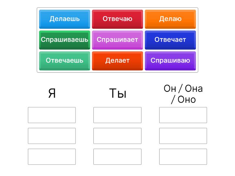 Я: Делаю, Спрашиваю, Отвечаю, Ты: Делаешь, Спрашиваешь, Отвечаешь, Он / Она / Оно: Делает, Спрашивает, Отвечает,