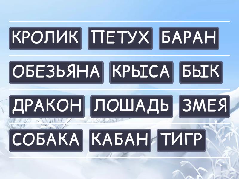 КРЫСА БЫК ТИГР КРОЛИК ДРАКОН ЗМЕЯ ЛОШАДЬ БАРАН ОБЕЗЬЯНА ПЕТУХ СОБАКА КАБАН,