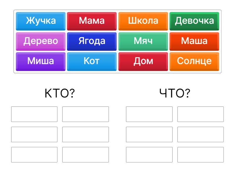 КТО?: Миша, Девочка, Мама, Жучка, Кот, Маша, ЧТО?: Дом, Мяч, Дерево, Солнце, Школа, Ягода,
