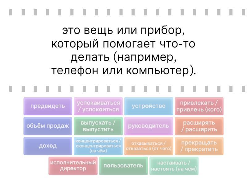 устройство - это вещь или прибор, который помогает что-то делать (например, телефон или компьютер)., исполнительный директор - главный человек в компании, который управляет всем и принимает важные решения., прекращать / прекратить - перестать что-то делать, закончить действие (например, прекратить разговор или остановить работу)., выпускать / выпустить - начинать продавать новый продукт или показывать что-то новое (например, выпустить новую модель телефона)., руководитель - человек, который управляет другими людьми на работе., доход - деньги, которые кто-то зарабатывает или получает от работы или бизнеса., настаивать / настоять (на чём) - говорить, что что-то очень важно, и требовать этого (например, настаивать на своём мнении)., расширять / расширить - сделать больше или добавить что-то новое, предвидеть - заранее догадаться или представить, что что-то случится., концентрироваться / сконцентрироваться (на чём) - внимательно сосредоточиться на чём-то одном, не отвлекаясь., привлекать / привлечь (кого) - сделать так, чтобы люди обратили внимание на что-то или захотели это (например, привлечь покупателей рекламой)., отказываться / отказаться (от чего) - сказать «нет», не соглашаться что-то делать или брать., пользователь - человек, который использует что-то, например, приложение или устройство., успокаиваться / успокоиться - перестать волноваться, стать спокойным., объём продаж - количество товаров или услуг, которые были проданы за какое-то время.,