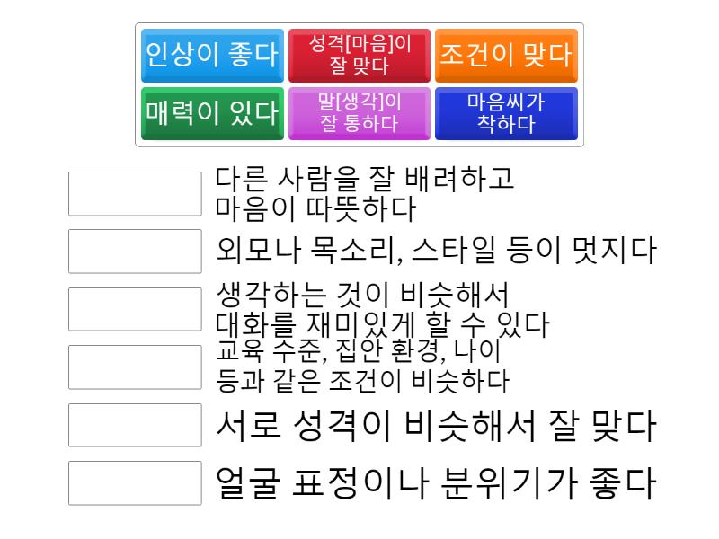 성격[마음]이 잘 맞다 - 서로 성격이 비슷해서 잘 맞다, 조건이 맞다 - 교육 수준, 집안 환경, 나이 등과 같은 조건이 비슷하다, 매력이 있다 - 외모나 목소리, 스타일 등이 멋지다, 말[생각]이 잘 통하다 - 생각하는 것이 비슷해서 대화를 재미있게 할 수 있다, 인상이 좋다 - 얼굴 표정이나 분위기가 좋다, 마음씨가 착하다 - 다른 사람을 잘 배려하고 마음이 따뜻하다,