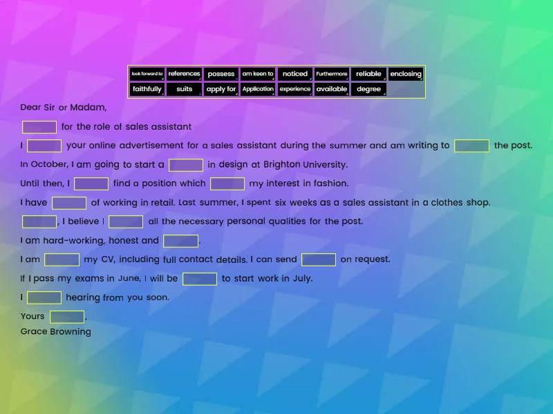 Dear Sir or Madam, ____ for the role of sales assistant I ____ your online advertisement for a sales assistant during the summer and am writing to ____ the post. In October, I am going to start a ____ in design at Brighton University. Until then, I ____ find a position which ____ my interest in fashion. I have ____ of working in retail. Last summer, I spent six weeks as a sales assistant in a clothes shop. ____, I believe I ____ all the necessary personal qualities for the post. I am hard-working, honest and ____. I am ____ my CV, including full contact details. I can send ____ on request. If I pass my exams in June, I will be ____ to start work in July. I ____ hearing from you soon. Yours ____, Grace Browning