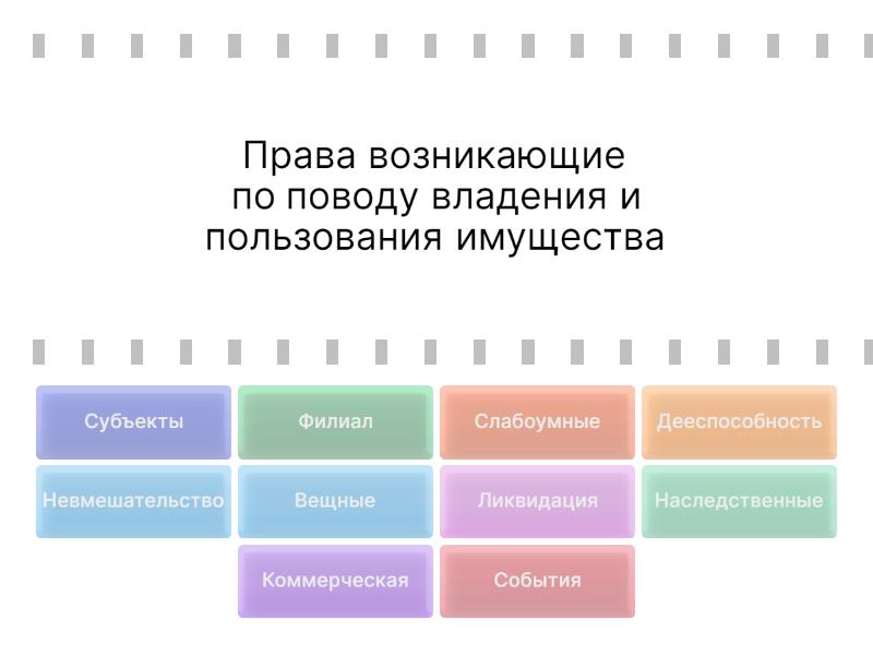 Вещные - Права возникающие по поводу владения и пользования имущества, События - Юридические факты которые не зависят от воли и сознаний человека, Дееспособность - Способность лица приобретать для себя права и отвечать по своему обязательствам, Филиал - Обособленные подразделения юрид. Лица расположенного вне места расположения данного лица и выполняющего часть или все его функции , Ликвидация - Прекращение деятельности юридического лица которое может быть добровольным и принудительным, Субъекты - Участники гражданских правоотношений, Наследственные - возникают в случае смерти собственника имущества, Слабоумные - недееспособные лица-это душевнобольные и….., Коммерческая - какая цель несет за собой привлечение прибыли , Невмешательство - принцип при котором государство и другие лица не имеют права вмешиваться в личные дела,