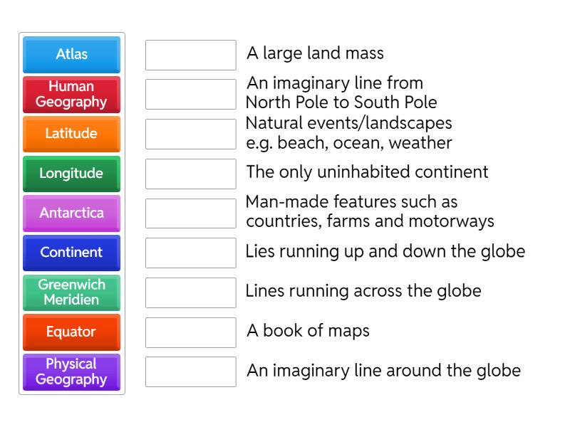Atlas - A book of maps, Physical Geography - Natural events/landscapes e.g. beach, ocean, weather, Human Geography - Man-made features such as countries, farms and motorways, Continent - A large land mass , Antarctica - The only uninhabited continent, Equator - An imaginary line around the globe, Greenwich Meridien - An imaginary line from North Pole to South Pole, Longitude - Lies running up and down the globe, Latitude - Lines running across the globe,