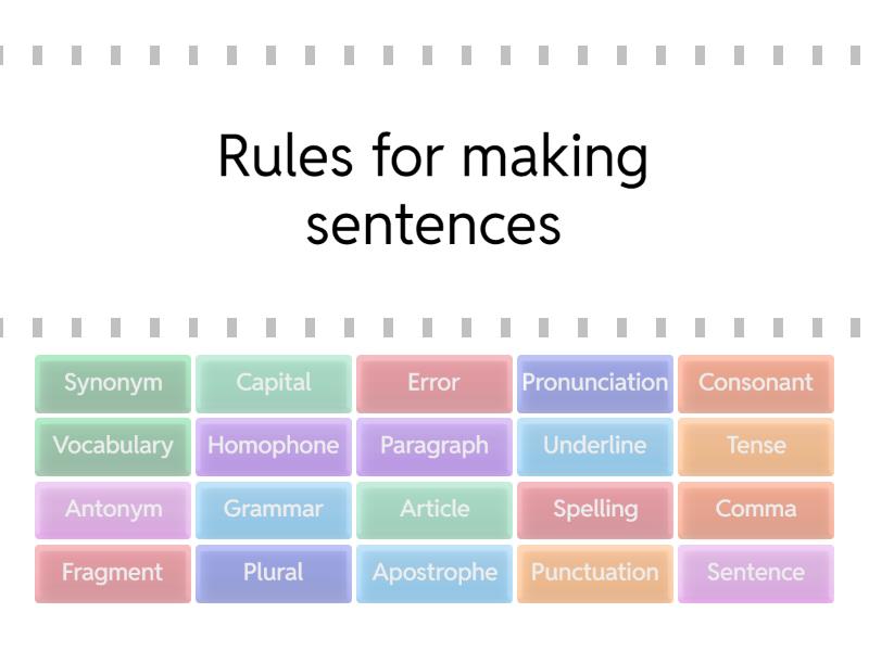 Grammar - Rules for making sentences, Spelling - Writing words with the correct letters, Punctuation - Marks like commas (,) or periods (.), Vocabulary - A group of words someone knows, Sentence - A group of words with a subject and verb , Pronunciation - The way a word is spoken , Capital - A big letter at the start of a sentence, Comma - A punctuation mark for pauses (,) , Paragraph - A group of sentences about one idea, Apostrophe - A mark for missing letters or possession ('), Error - A mistake in writing or speaking, Tense - Shows time in grammar, Synonym - A word with a similar meaning , Antonym - A word with the opposite meaning, Plural - More than one in gramma, Article - Words like "a," "an," or "the", Consonant - A letter that is not a vowel , Homophone - Words that sound the same but differ in meaning, Underline - A line under text for emphasis (_) , Fragment - An incomplete sentence,