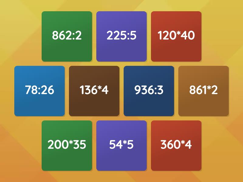 200*35 - 7000, 360*4 - 1440, 862:2 - 431, 120*40 - 4800, 78:26 - 3, 54*5 - 270, 225:5 - 45, 136*4 - 544, 861*2 - 1722, 936:3 - 312,